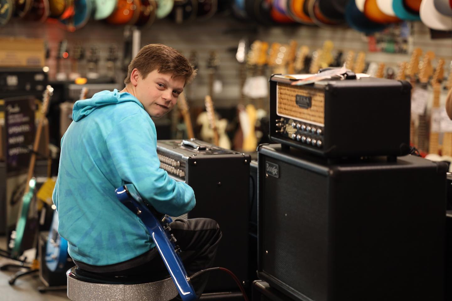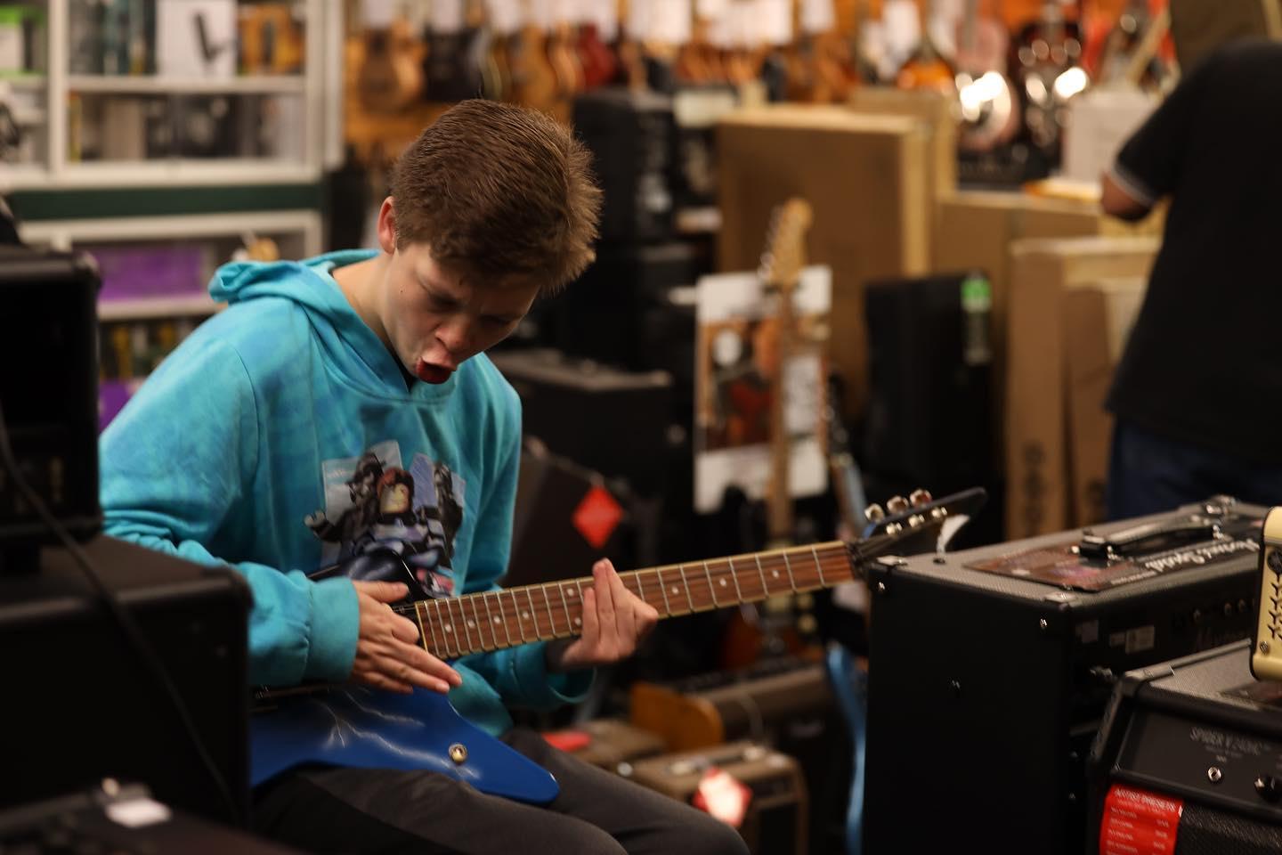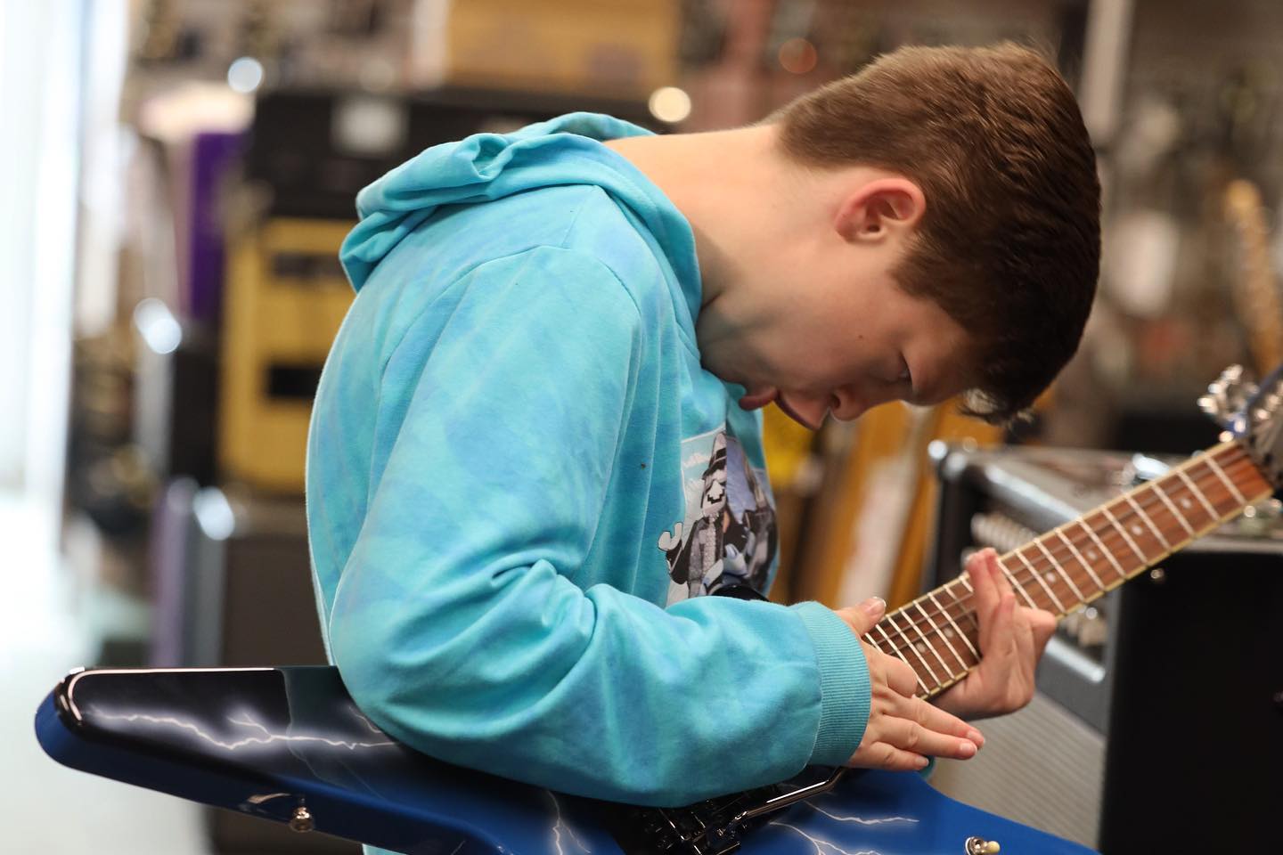 Eight months ago a customer saw Fallon rocking out. The person left that day but was so moved by the interaction that they returned to the store and bought the $800 Pantera guitar, with one condition: that it would be anonymously given to Fallon the next time he came in to play.